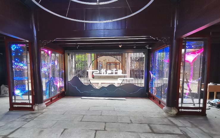 【项目描述】:项目安装在浙江台州某景点,采用3.91*7.81mm间距的定制LED透明屏。无龙骨的结构,有效提高通透性,及整体外形美观。和整个景点环境融合。动态绚丽的影像,常规显示及透明显示,效果都完美呈现在屏幕上。